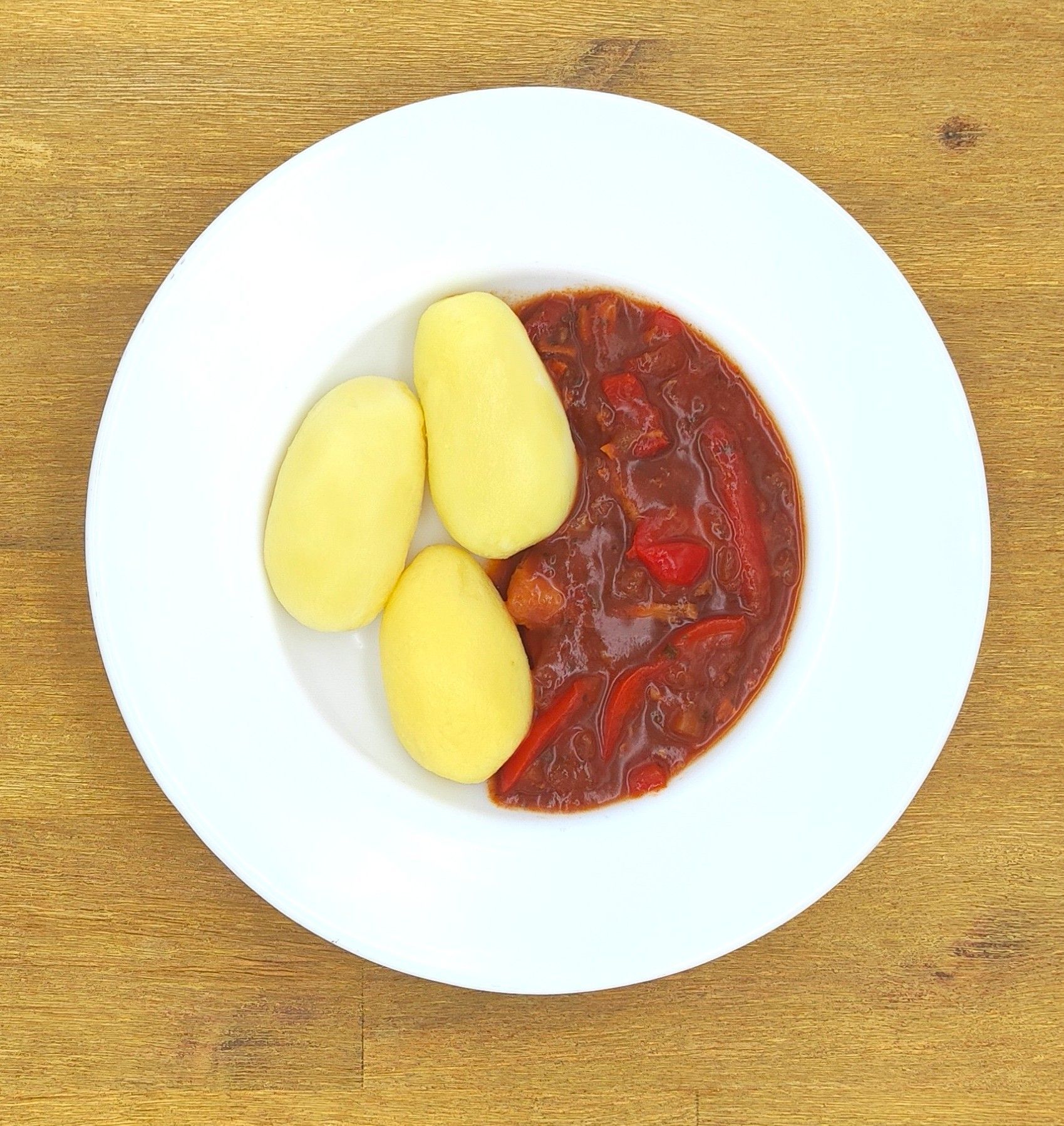 Hähnchengulasch mit Paprika und Bio-Zwiebeln und Salzkartoffeln