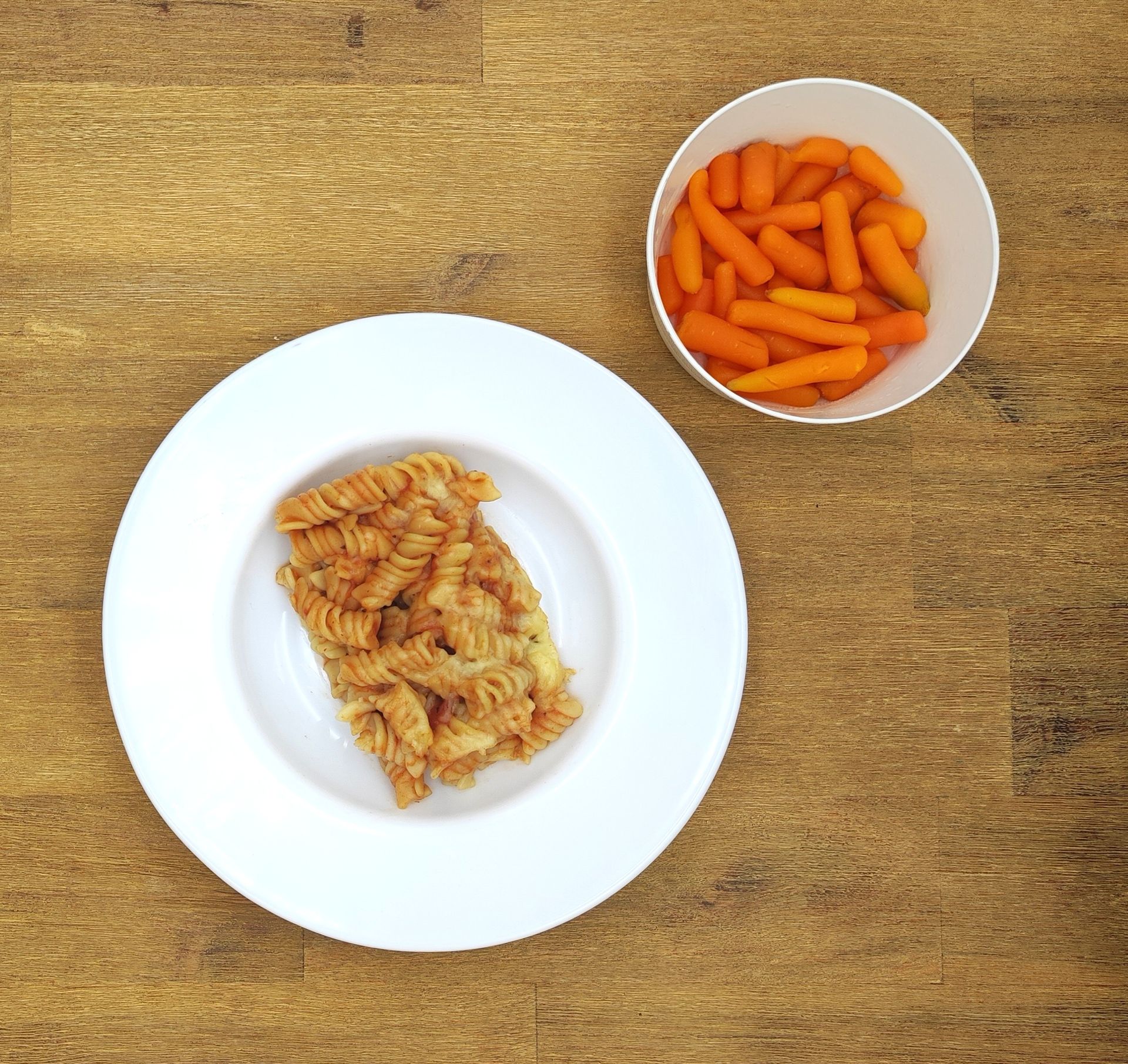 Nudelgratin mit Bio-Tomaten und Gouda überbacken, dazu Fingermöhren "natur"