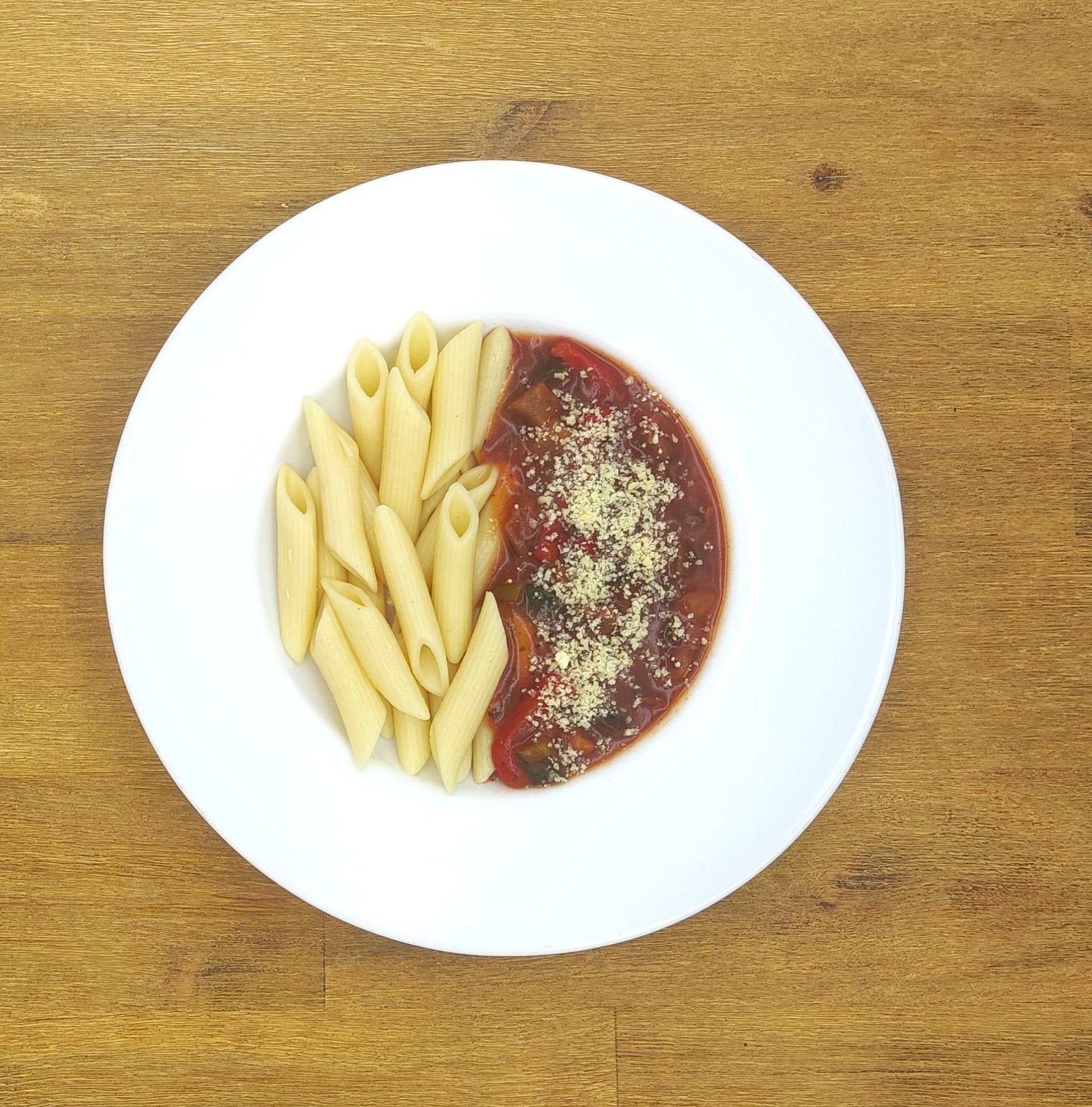 Verdure-Sauce mit Zucchini, Paprika und Auberginen, dazu Pasta und geriebener Hartkäse als Topping