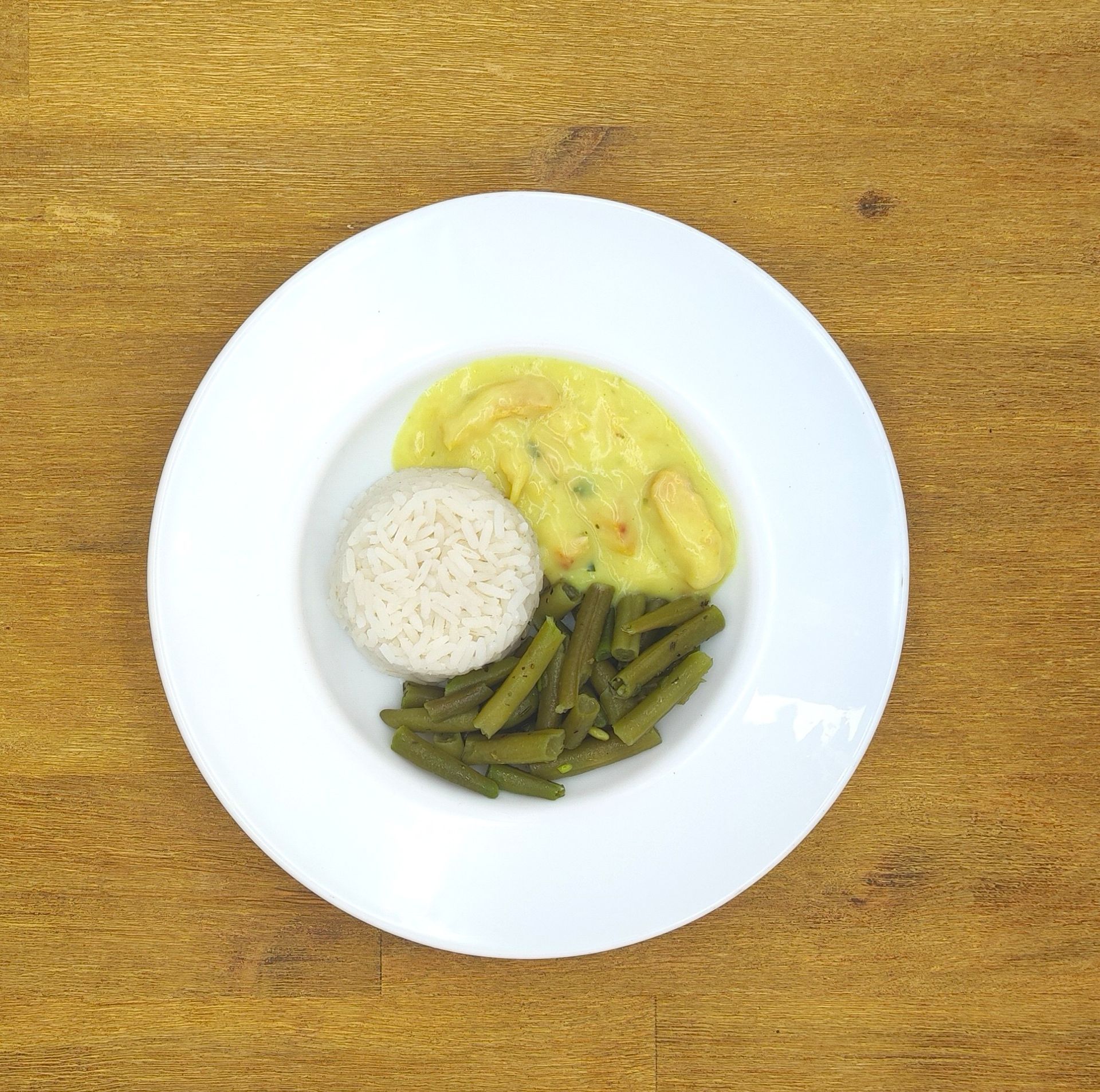 Hähnchengeschnetzeltes in Curryrahmsauce mit Langkornreis und Brechbohnen "natur"