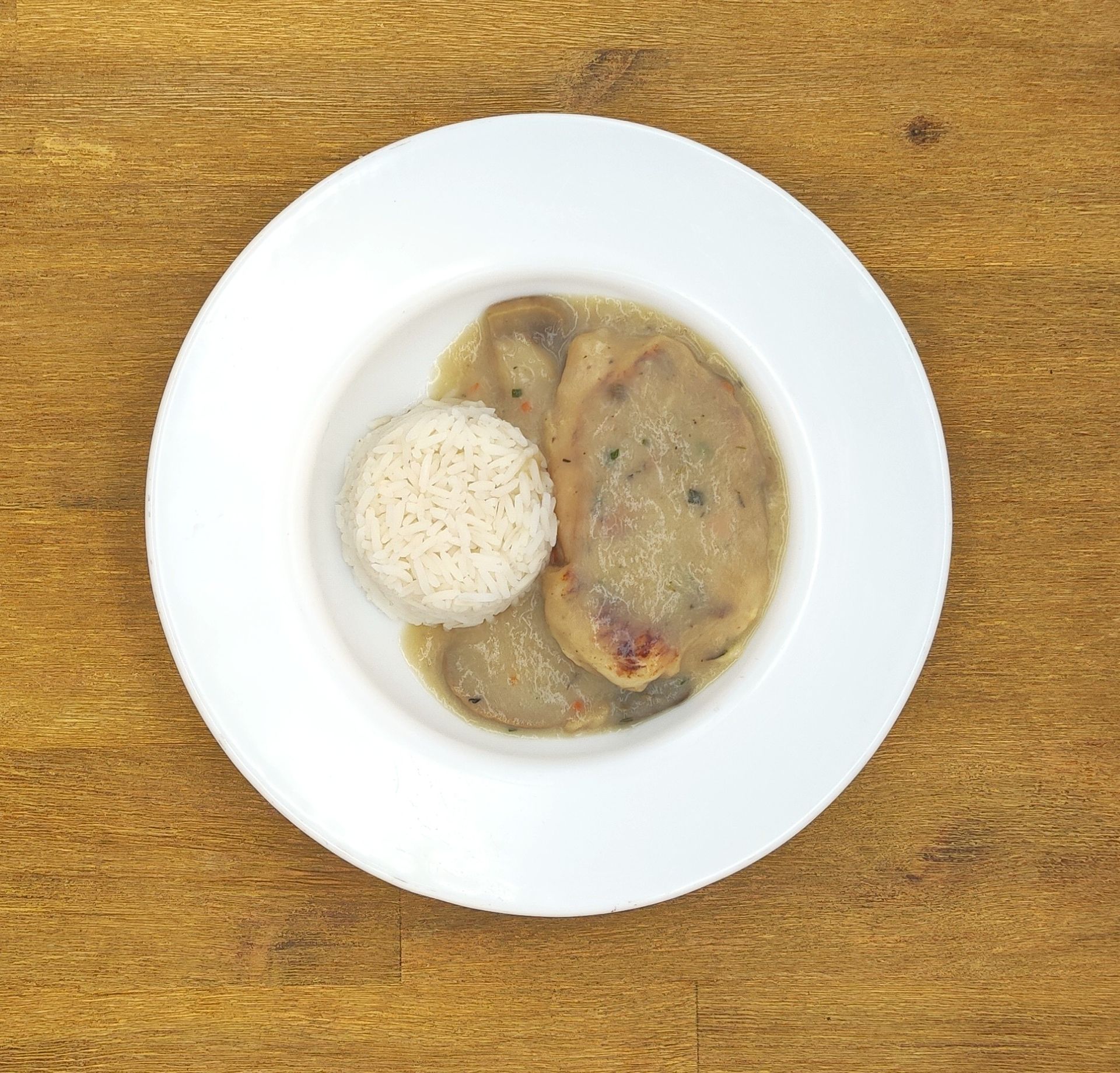 Hähnchenbrust "natur" in Champignonrahmsauce und Langkornreis