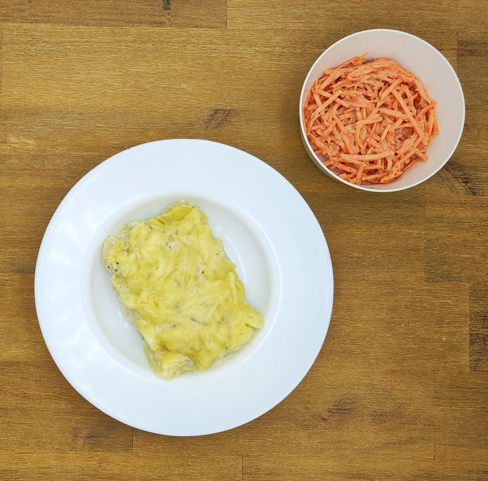 Kattoffelgratin mit Gouda überbacken, dazu einen Möhrensalat in Tomaten-Dressing
