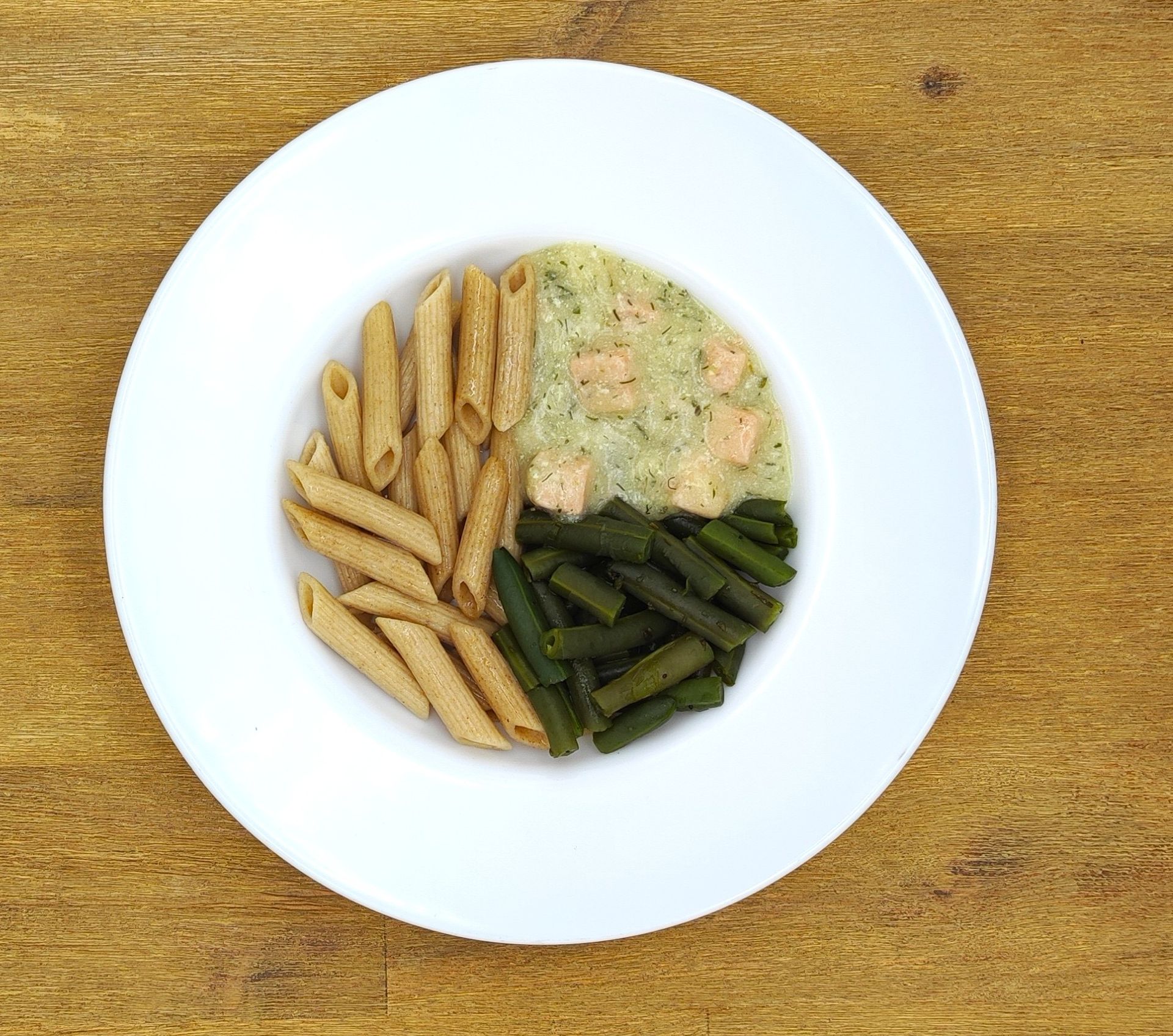 Lachswürfel in Dillsauce mit Vollkorn-Pasta und