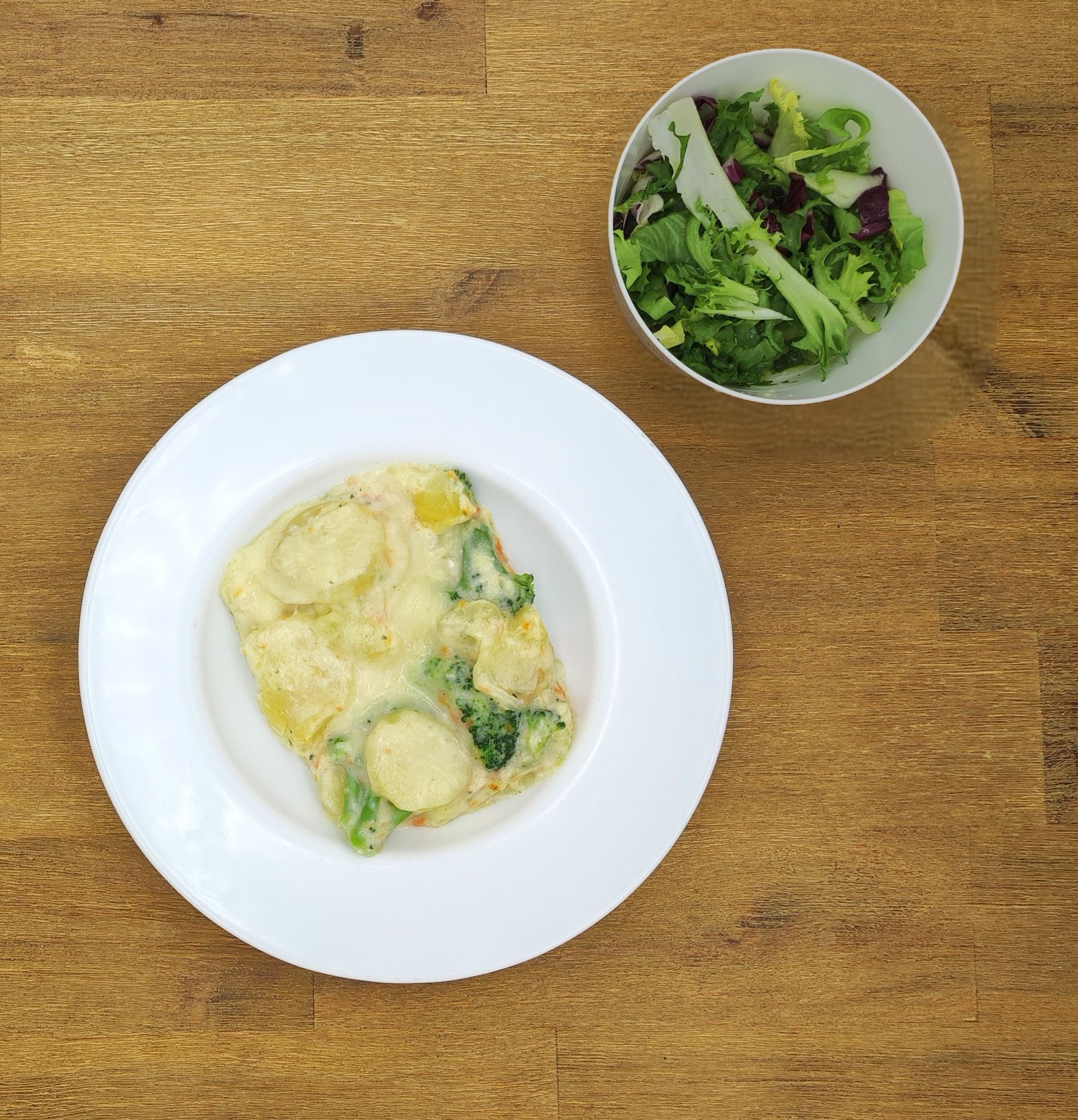 Rahmkartoffeln mit Erbsen und Mais "natur", dazu Blattsalat in