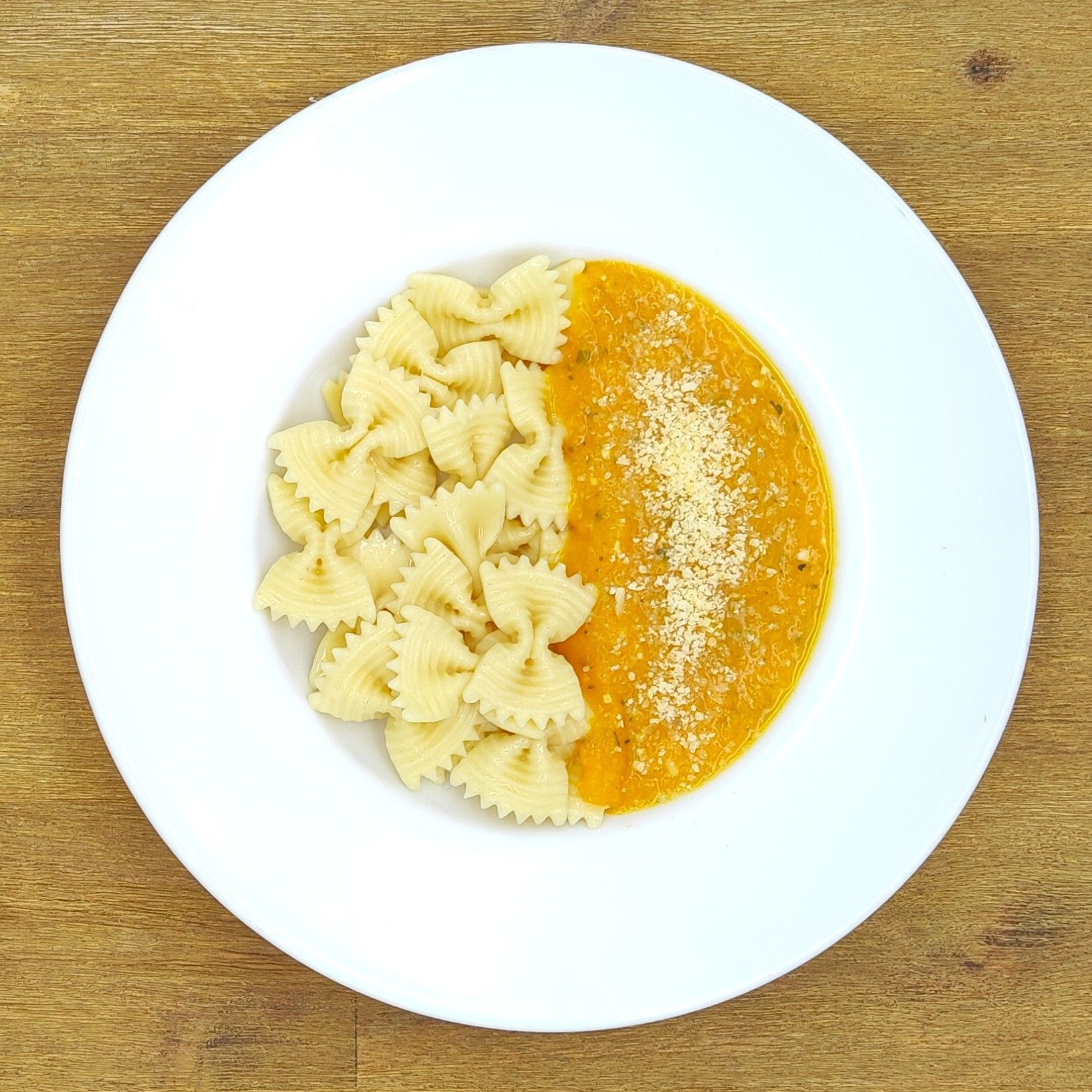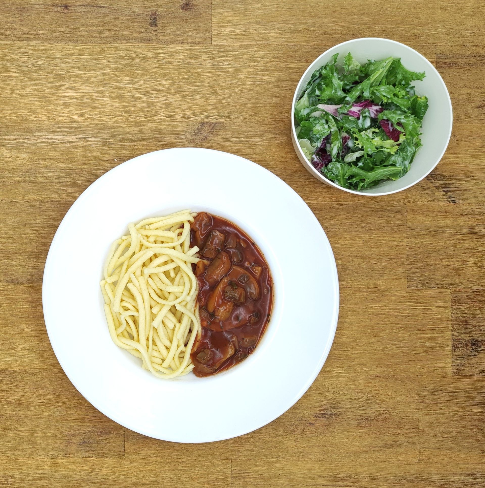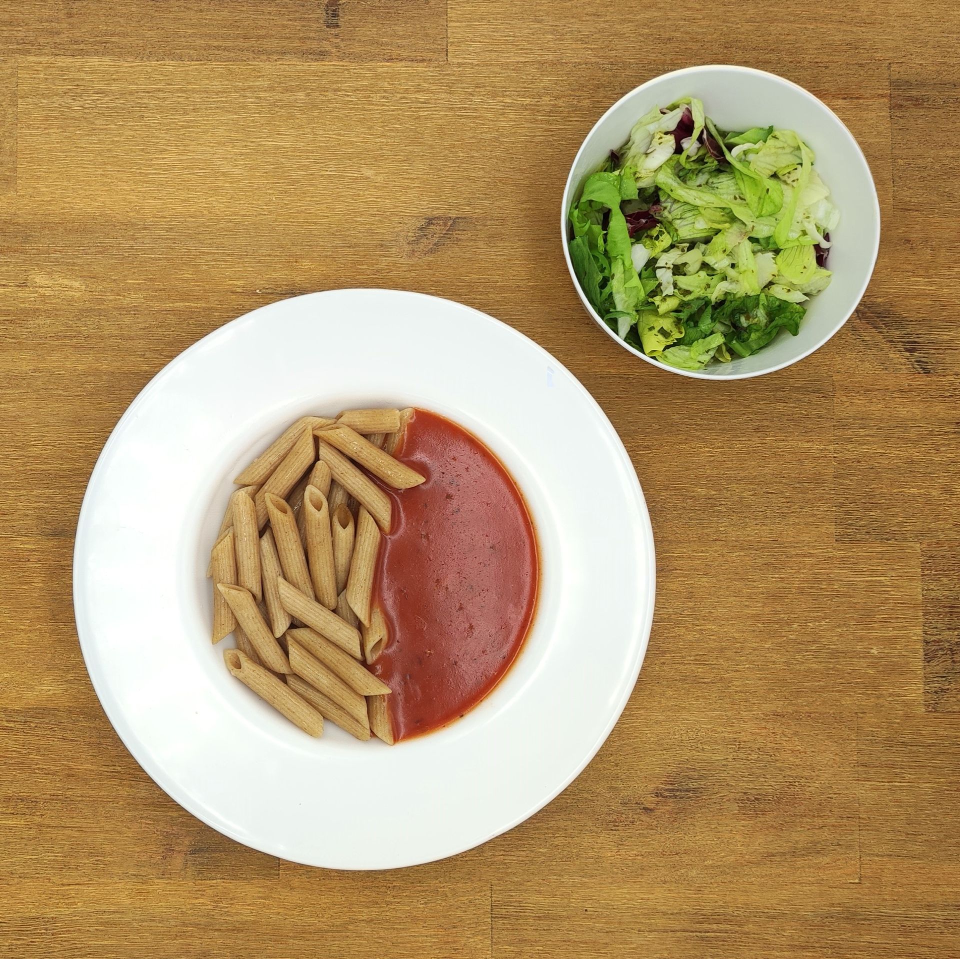 Tomatensauce mit Bio-Tomaten, dazu Blattsalat in Essig-Öl-Dressing